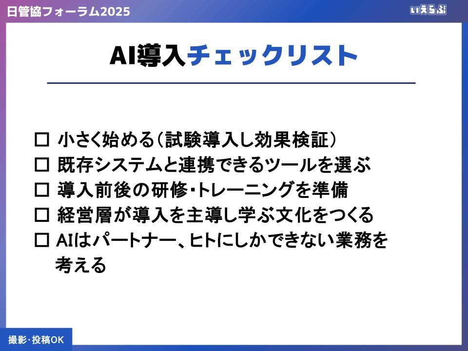 導入時にはチェックリストを活用して、順番や進め方を検討・確認することで、会社全体でスムーズにAIを取り入れられます。こうしたチェックリストは、簡単なガイドラインとしても機能します。