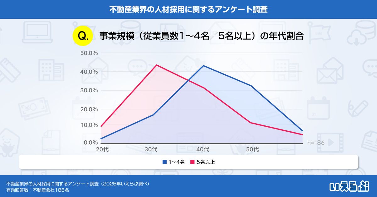 事業規模(従業員数1~4名/5名以上)の年代割合を見てみると、不動産業界では、1~4名の小規模事業者が全体の84.6%を占めており(※)、業界全体としても平均年齢が高い傾向が見られました。