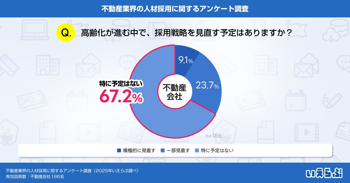 「高齢化が進む中で、採用戦略を見直す予定はありますか?」という質問では、「積極的に見直す」(9.1%)、「一部見直す」(23.7%)という回答もあった一方で、「特に予定はない」が67.2%と最も多い結果となりました。