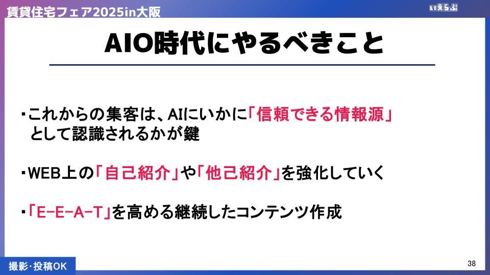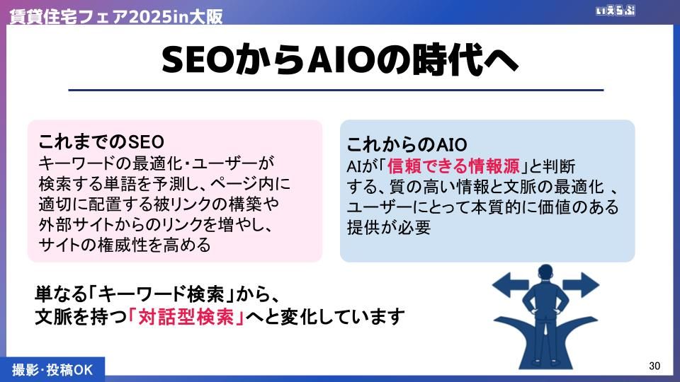 こうした変化の中で重要になるのが、新しい概念である「AIO(AI最適化)」です。セミナーでは、AIが回答を生成する際に「信頼できる情報源」として引用してもらうための情報発信について解説しました。