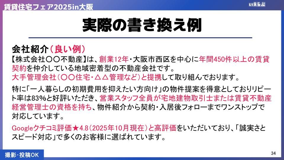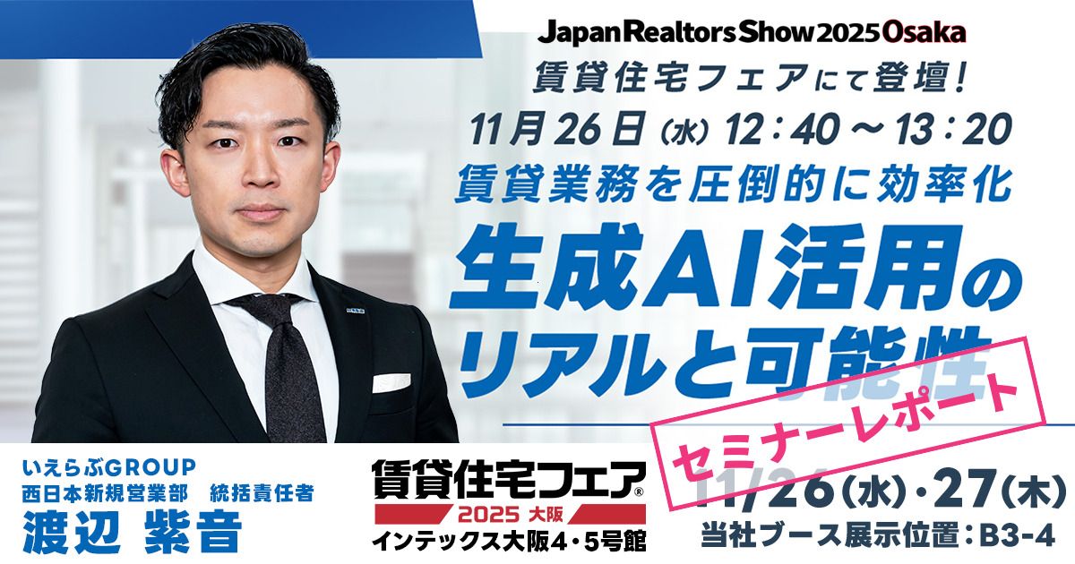2025年11月26日(水)に実施された賃貸住宅業界最大のイベント「賃貸住宅フェア2025大阪」にて、当社西日本新規営業部 統括責任者の渡辺紫音がセミナーに登壇しました。セミナーでは、単なるツールの紹介だけでなく新しい集客戦略「AIO」や、管理業務を効率化するAIの実装について解説しました。