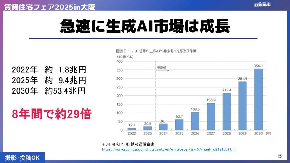 生成AI市場は爆発的な拡大を続けており、技術の進化スピードも加速度的に高まっています。かつて専門知識が必要だった画像生成なども、今では誰でも扱える段階にまで進化しました。生成AIは、未来の技術ではなく、現場の負担を軽減するための「当たり前の業務ツール」として定着し始めています。