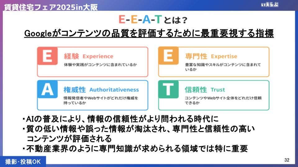 特に重要なのは、経験にもとづく情報。専門家ならではの解釈や、現場の経験を加えた情報は、AIから「価値ある情報」として扱われやすく、検索・生成の双方で評価される傾向があります。不動産業界のように、専門知識が求められる領域では特に重要となります。