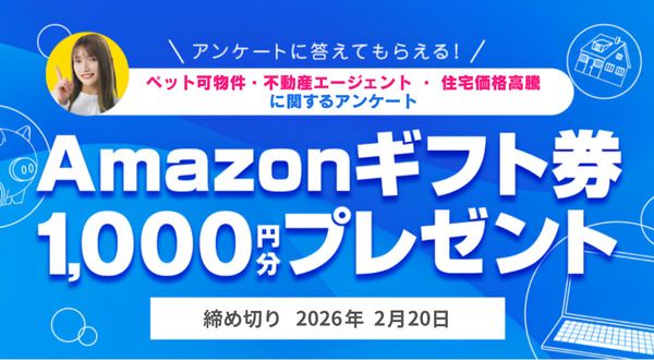 現在、「ペット可物件・不動産エージェント・住宅価格高騰に関するアンケート」を実施しております。アンケートにお答えいただいた方より、抽選で50名様に1,000円分のAmazonギフト券をプレゼントします。