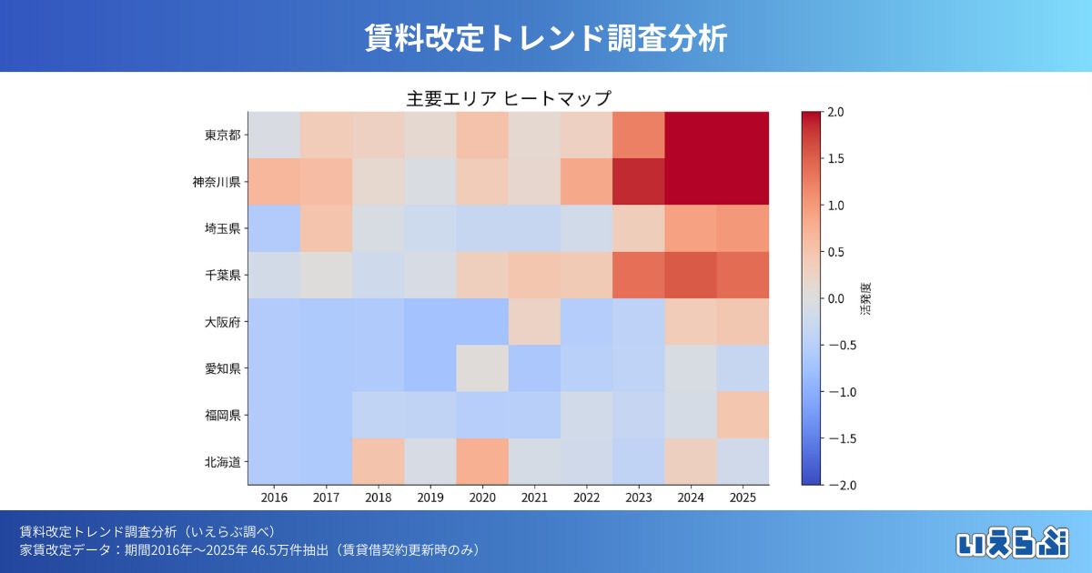 エリアごとの「賃上げの勢い」をヒートマップで可視化。赤色が濃いほど、その年の平均よりも活発であることを示します。