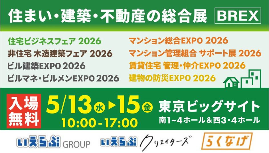 2026年5月13日(水)~15日(金)に東京ビッグサイトで開催される「住まい・建築・不動産の総合展【BREX】賃貸住宅 管理・仲介EXPO 2026/不動産売買ゾーン」に、株式会社いえらぶGROUP(本社:東京都新宿区、代表者:岩名泰介、以下「いえらぶGROUP」)およびグループ会社2社を含む計3社で出展いたします。