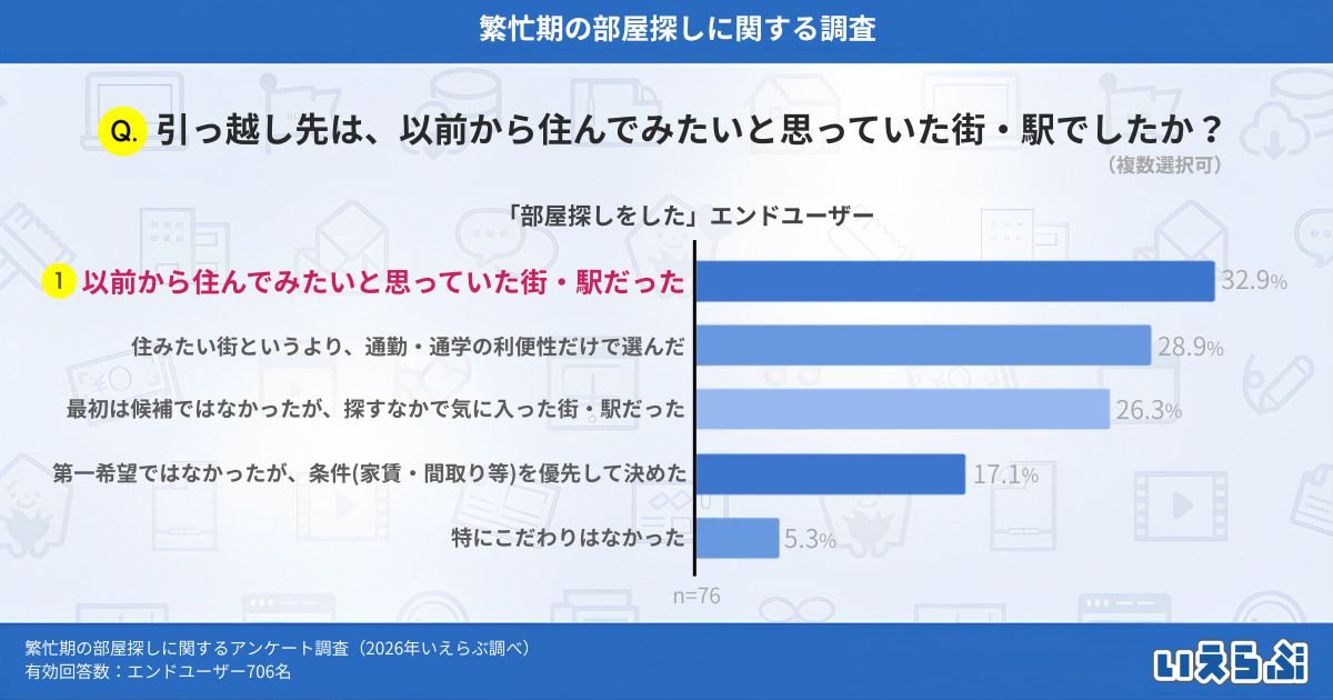 「部屋探しをした」と回答したエンドユーザーに、「引っ越し先は、以前から住んでみたいと思っていた街・駅でしたか?」と質問したところ、「以前から住んでみたいと思っていた街・駅だった」が32.9%で最多となりました。一方で、「住みたい街というより、通勤・通学の利便性だけで選んだ」(28.9%)、「最初は候補ではなかったが、条件(家賃・間取り等)を優先して決めた」(26.3%)という回答も多く、理想のエリアよりも、現実的な条件を重視して部屋を決めるエンドユーザーも少なくないことがうかがえます。
