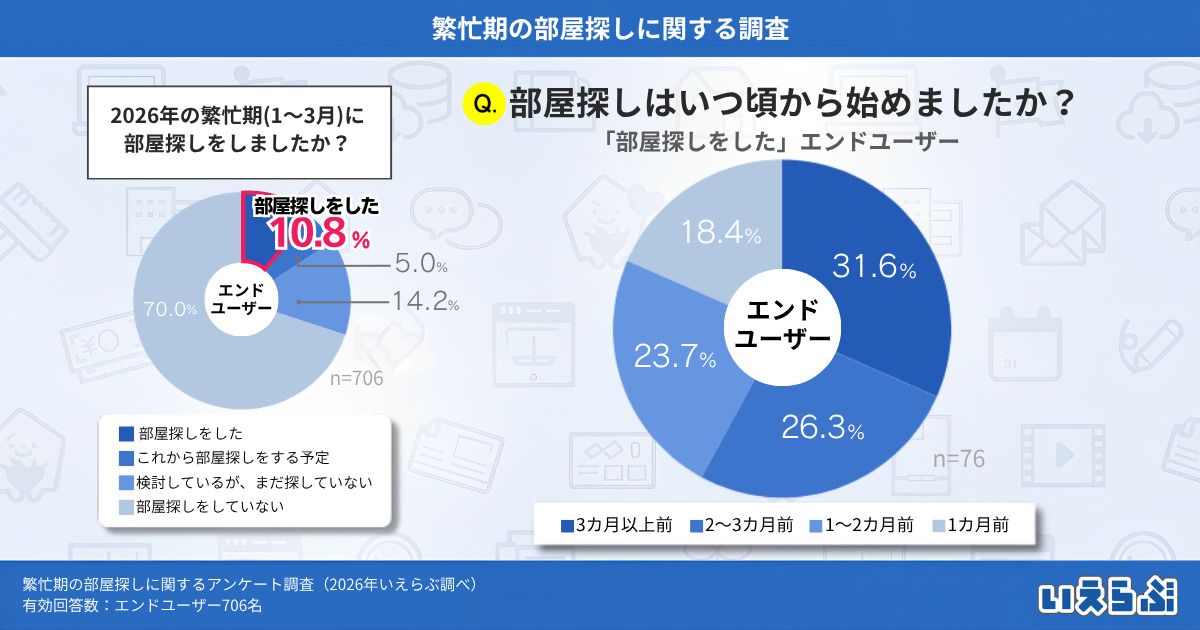 「2026年の繁忙期(1~3月)に、部屋探しをしましたか?」という質問に対し、「部屋探しをした」と回答したエンドユーザーは10.8%でした。