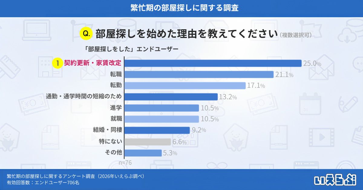 部屋探しを始めた理由については、「契約更新・家賃改定」が25.0%で最多となり、次いで「転職」(21.1%)、「転勤」(17.1%)が続きました。