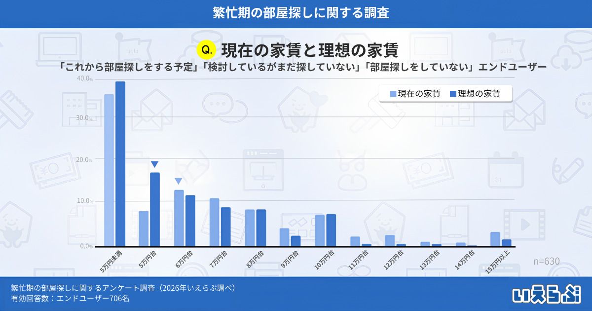 また、「これから部屋探しをする予定」「検討しているがまだ探していない」「部屋探しをしていない」と回答したエンドユーザーに、現在住んでいる家の家賃と理想の家賃について質問したところ、現在住んでいる家の家賃の中央値は約6.4万円、理想の家賃の中央値は約5.6万円となりました。