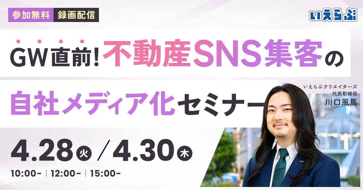 不動産業界特化のDX支援サービスを展開する株式会社いえらぶGROUP(本社:東京都新宿区、代表取締役:岩名泰介、以下「いえらぶGROUP」)は、4月28日(火)・30日(木)の2日間、録画配信(ライブ形式)にて、『不動産SNS集客の「自社メディア化」セミナー ~SNSを経営資産に変え、集客・採用・成約率を最大化する普遍的ロードマップ~』を開催いたします。